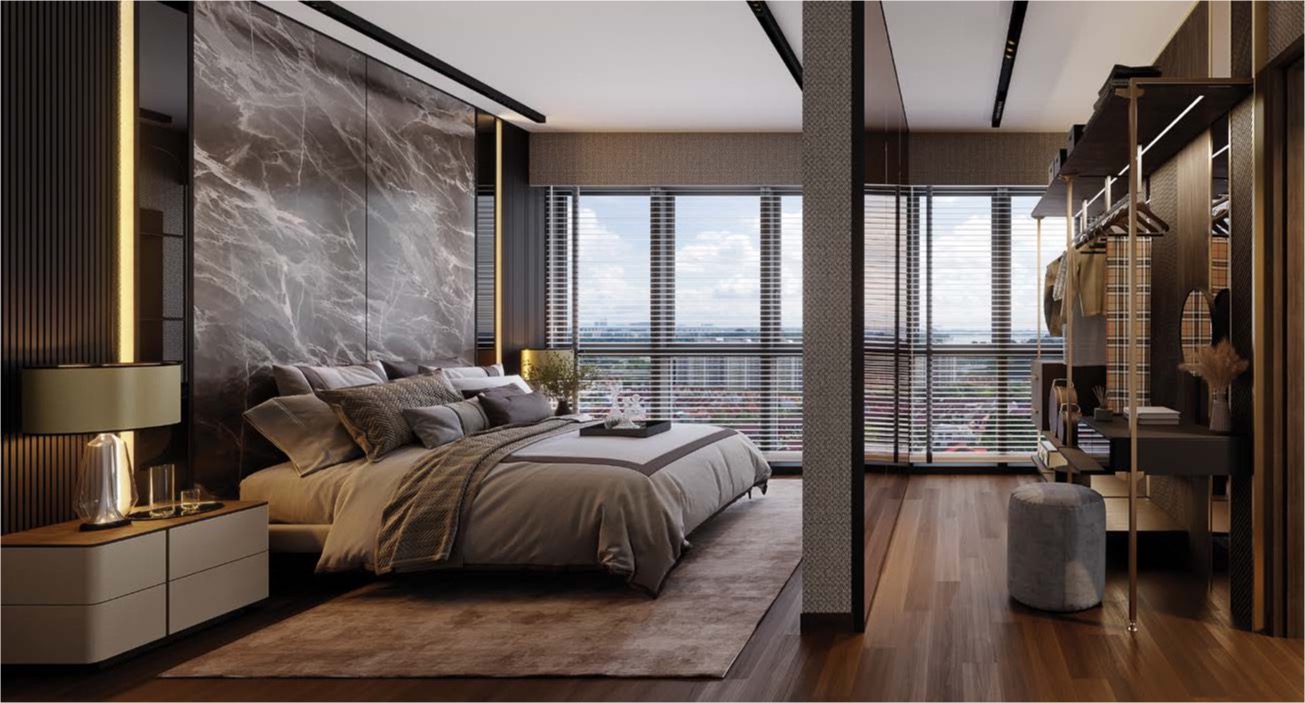 A key highlight of this bedroom lies in the meticulous attention to detail in the furnishings. From the flute panel on the bedside table to the pole system structure within the open wardrobe, each element adds visual interest and texture to the space. The clean lines and simple white false ceiling, combined with the horizontal black stripes of lighting within the unique artwork frame, blend marble grain, wood strip, and black accents to craft a dreamy and contemporary atmosphere, reflecting the current design trends.